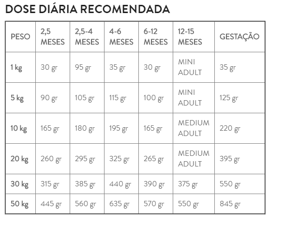 INGREDIENTES Salmão (18%)milhoarroz (14%)proteínas de salmão desidratadasfarinha de glúten de milhogordura animalproteínas animais hidrolisadasproteína de batatafermentocolagénio hidrolisadopolpa de beterrabafibra vegetalcloreto de potássiofruto-oligossacáridos (0,43%)óleo de peixecarbonato de cálciosalaloé vera (0,005%). ADITIVOS NUTRICIONAIS VitaminaA 27000 UI VitaminaD3 1800 UI VitaminaE 500 mg VitaminaC 70 mg Biotina 0.3 mg Sulfato ferroso mono-hidratado 260 mg (Fe: 86 mg) Iodeto de potássio 1.9 mg (I: 1.4 mg) Sulfato de cobre penta-hidratado 33mg (Cu: 8.8 mg) Sulfato de manganês mono-hidratado 123mg (Mn: 40mg) Sulfato de zinco mono-hidratado 407mg (Zn: 148mg) Selenito de sódio 0.2mg (Se: 0.1mg) Com antioxidantes naturais. COMPONENTES ANALÍTICOS 29.0% Proteína 20.0% Matéria gorda bruta 2.0% Fibra bruta 6.5% Matéria inorgânica 1.2% Cálcio 1.0% Fósforo 0.7% Ómega- 3 2.6% Ómega- 6
