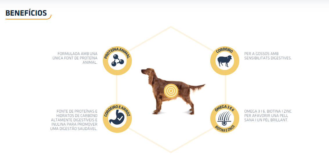 INGREDIENTES Cordeiro (17%), milho, proteínas de milho, arroz (14%), gordura animal,estabilizada com tocoferóis mistos de origem natural, proteínas desidratadas de cordeiro, farinha de milho, polpa de beterraba, aromatizantes hipoalergénicos, óleo de peixe, cloreto de potássio, fruto-oligossacáridos, sal, polifenóis naturais(0.01%) Aditivos nutricionais: Vitamina A 27000 UI Vitamina D3 1800 UI Vitamina E 500 mg Biotina 0.2mg Sulfato ferroso mono-hidratado 260 mg (Fe: 86mg) Iodeto de potássio 1.9 mg (I: 1.4 mg) Sulfato de cobre penta-hidratado 33mg (Cu: 8.8 mg) Sulfato de manganês mono-hidratado 123mg (Mn: 40 mg) Sulfato de zinco mono-hidratado 407 mg (Zn: 148 mg) Selenito de sódio 0.2mg (Se: 0.1mg) Com antioxidantes naturais. COMPONENTES ANALÍTICOS 26.0% Proteína 17.0% Matéria gorda bruta 2.0% Fibra bruta 7% Matéria inorgânica 0.3% Ómega 3 2.8% Ómega 6