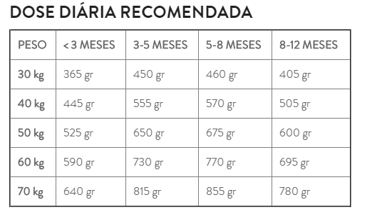 INGREDIENTES Frango (16%), proteínas desidratadas de aves, trigo, proteínas de milho, arroz (10%), milho, gordura animal,estabilizada com tocoferóis mistos de origem natural, farinha de milho, proteínas animais hidrolizadas, polpa de beterraba, óleo de peixe, fibra de aveia, sal, cloreto de potássio, proteínas plasmáticas,fonte natural de imunoglobulinas(0.5%), extrato de levedura,fonte natural de nucleótidos(0.05%), glucosamina (460 mg/kg), sulfato de condroitina(350 mg/kg) ADITIVOS NUTRICIONAIS VitaminaA 27000 UI VitaminaD3 1800 UI VitaminaE 500 mg VitaminaC 70 mg Sulfato ferroso mono-hidratado 260 mg (Fe: 86mg) Iodeto de potássio 1.9 mg (I: 1.4 mg) Sulfato de cobre penta-hidratado 33mg (Cu: 8.8 mg) Sulfato de manganês mono-hidratado 123mg (Mn: 40 mg) Sulfato de zinco mono-hidratado 407mg (Zn: 148mg) Selenito de sódio 0.24 mg (Se: 0.1mg) Com antioxidantes naturais. COMPONENTES ANALÍTICOS 29.0% Proteína 16.0% Matéria gorda bruta 2.5% Fibra Bruta 6.5% Matéria Inorgânica 1.2% Cálcio 1% Fósforo 0.3% Ómega- 3 2.9% Ómega- 6