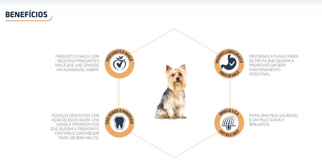 Graças às suas vitaminas e aos polifenóis naturais, o ADVANCE Yorkshire ajuda a reforçar as defesas e as barreiras naturais do seu Yorkshire. Além disso, contém imunoglobulinas e fibra de maçã para facilitar a digestão, chá verde e substâncias minerais que cuidam da saúde da sua boca, e ainda presunto e maçã para satisfazer os paladares mais exigentes.