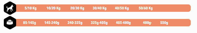 Composição: Proteína de carne desidratada 30% (salmão 4%), trigo, subprodutos de origem vegetal (polpa de beterraba 1,5%), gordura de ave, arroz 4%, cevada, alfarrobeira, substâncias minerais e vitaminas. Análise: Proteína 25% / Gordura 12%