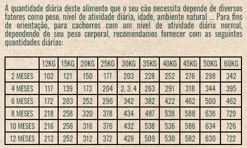 Composição Salmão desidratado, tapioca, gordura de frango (fonte de ácidos graxos Ω-6), ervilhas, proteína de salmão hidrolisada, levedura e extrato de levedura-Saccharomyces cerevisiae (fonte de mananooligossacarídeos - MOS e β-glucanos), proteína de batata , batata doce, vagem de alfarroba, polpa de beterraba, óleo de salmão (fonte de ácidos graxos Ω-3-EPA e DHA), inulina (fibra solúvel de chicória, fonte de fosfooligossacarídeos - FOS), celulose natural (fonte de fibra insolúvel) , minerais, fibra dietética solúvel extraída de Plantago ovata, óleos essenciais (orégano, canela, cravo, tomilho, alecrim, hortelã, chá verde), hidrolisado de crustáceo (fonte de glucosamina), cartilagem hidrolisada (fonte de condroitina), iúca, concentrado de suco de melão liofilizado (rico em superóxido dismutase - SOD) Componentes analíticos Proteína bruta 30,00%, Gordura bruta 18,00%, Fibra bruta 2,40%, Cinza bruta 7,80%, Cálcio 1,40%, Fósforo 0,95%, Umidade 9,00%, EPA + DHA 0,63%, cloridrato de glucosamina 380 mg / kg, sulfato de condroitina 240 mg / kg. Aditivos Aditivos nutricionais: Vitamina A 24.000 UI / kg., Vitamina D-3 1.760 UI / kg., Vitamina E 500 mg / kg., Vitamina C 220 mg / kg., Biotina 2.200 mcg / kg., L-Carnitina 100 mg / kg, Cloreto de colina 1.980 mg / kg., Taurina 1.300 mg / Kg., Ferro (sulfato ferroso monohidratado) 66 mg / kg., Ferro (quelato de hidrato de glicina ferroso) 13 mg / kg, Cobre (sulfato cúprico pentahidratado ) 5,5 mg / kg., Cobre (quelato cúprico de hidrato de glicina) 3,7 mg / kg., Manganês (sulfato de manganês monohidratado) 41 mg / kg., Manganês (quelato de manganês hidrato de glicina) 13 mg / kg., Zinco (sulfato de zinco mono-hidratado) 83 mg / kg., Zinco (quelato de zinco de hidrato de glicina) 50 mg / kg., Iodo (iodeto de potássio) 2,2 mg / kg., Selênio (selenito sódio) 0,12 mg / kg., Selênio (hidroxi análogo da selenometionina) 0,12 mg / kg. Aditivos tecnológicos: Antioxidantes naturais (óleos vegetais ricos em tocoferóis). Como usar O produto deve ser administrado na forma seca. Deixe sempre água limpa e fresca disponível para seu cão. Manter o recipiente bem fechado, em local fresco, seco e ventilado, ao abrigo da luz e do sol. Use de preferência antes de: Data e lote indicados no verso da embalagem.