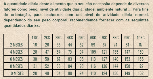 Composição Carne de frango desidratada, tapioca, gordura de frango (fonte de ácidos graxos Ω-6), proteína de frango hidrolisada, ervilhas, fermento e extrato de levedura-Saccharomyces cerevisiae (fonte de mananooligossacarídeos - MOS e β-glucanos), fígado de frango hidrolisado, óleo sh (Fonte de ácidos graxos Ω-3-EPA e DHA), feijão de alfarroba, ovo desidratado, proteína de batata, batata doce, polpa de beterraba doce, inulina (chicória solúvel, fonte de fosfo-oligossacarídeos - FOS), celulose natural (fonte de fibra insolúvel), minerais, fibra dietética solúvel extraída de Plantago ovata, óleos essenciais (orégano, canela, cravo, tomilho, alecrim, hortelã-pimenta, chá verde), hidrolisados de crustáceos (fonte de glucosamina), hidrolisados de cartílage (fonte de condroitina), iúca, concentrado de suco de melão liofilizado (rico em superóxido dismutase-SOD). Constituintes analíticos Proteína bruta 26,00%, matéria gorda bruta 15,00%, bruta 2,50%. cinza bruta 7,90%, cálcio 1,60%, fósforo 0,95%, umidade 9,00%, EPA + DHA 0,56%, cloridrato de glucosamina 380 mg / kg, sulfato de condroitina 240 mg / kg. Aditivos Aditivos nutricionais: Vitamina A 24.000 UI / kg, Vitamina D-3 1.760 UI / kg, Vitamina E 500 mg / kg, Vitamina C 220 mg / kg, Biotina 2.200 mcg / kg, L-carnitina 100 mg / kg, cloreto de colina 1.980 mg / kg, taurina 1.300 mg / Kg, ferro (sulfato ferroso monohidratado) 66 mg / kg, ferro (quelato de ferro de hidrato de glicina) 13 mg / kg, cobre (sulfato de cobre pentahidratado) 5,5 mg / kg, cobre (quelato de cobre de hidrato de glicina) 3,7 mg / kg, manganês (sulfato de manganês monohidratado) 41 mg / kg, Manganês (quelato de manganês de hidrato de glicina) 13 mg / kg, zinco (sulfato de zinco monohidratado) 83 mg / kg, zinco (quelato de zinco de hidrato de glicina) 50 mg / kg, Iodo (iodeto de potássio) 2,2 mg / kg, selênio (selenito de sódio) 0,12 mg / kg, selênio (análogo hidroxilado de selenometionina) 0,12 mg / kg. Aditivos tecnológicos: Antioxidantes naturais (óleos vegetais ricos em tocoferóis). Forma de uso O produto deve ser servido na forma seca. Mantenha sempre água limpa e fresca disponível para seu cão. Manter o recipiente fechado, em local fresco, seco e ventilado, ao abrigo da luz e do sol. Use de preferência antes de: Data e lote indicados no verso da embalagem.