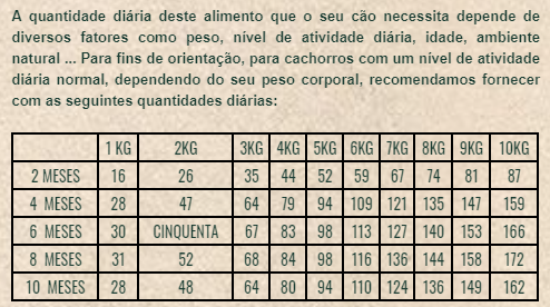Composição Salmão desidratado, tapioca, gordura de frango (fonte de ácidos graxos Ω-6), ervilhas, proteína de salmão hidrolisada, levedura e extrato de levedura-Saccharomyces cerevisiae (fonte de mananoligossacarídeos - MOS e β-glucanos), proteína de batata, batata doce, vagem de alfarroba, polpa de beterraba, óleo de salmão (fonte de ácidos graxos Ω-3-EPA e DHA), inulina (fibra solúvel de chicória, fonte de fosfooligossacarídeos - FOS), celulose natural (fonte de fibra insolúvel), minerais, fibra dietética solúvel extraída de Plantago ovata, óleos essenciais (orégano, canela, cravo, tomilho, alecrim, hortelã-pimenta, chá verde), hidrolisado de crustáceo (fonte de glucosamina), cartilagem hidrolisada (fonte de condroitina), mandioca, concentrado de suco de melão liofilizado (Rico em superóxido dismutase - SOD). Componentes analíticos Proteína bruta 31,00%, gordura bruta 20,00%, Fibra bruta 2,40%, Cinza bruta 7,80%, Cálcio 1,40%, Fósforo 0,95%, Umidade 9,00%, EPA + DHA 0,63%, cloridrato de glucosamina 380 mg / kg, sulfato de condroitina 240 mg / kg Aditivos Aditivos nutricionais: Vitamina A 24.000 UI / kg., Vitamina D-3 1.760 UI / kg., Vitamina E 500 mg / kg., Vitamina C 220 mg / kg., Biotina 2.200 mcg / kg., L-Carnitina 100 mg / kg, Cloreto de colina 1.980 mg / kg., Taurina 1.300 mg / Kg., Ferro (sulfato ferroso monohidratado) 66 mg / kg., Ferro (quelato de hidrato de glicina ferroso) 13 mg / kg, Cobre (sulfato cúprico pentahidratado ) 5,5 mg / kg., Cobre (quelato cúprico de hidrato de glicina) 3,7 mg / kg., Manganês (sulfato de manganês monohidratado) 41 mg / kg., Manganês (quelato de manganês hidrato de glicina) 13 mg / kg., Zinco (sulfato de zinco mono-hidratado) 83 mg / kg., Zinco (quelato de zinco de hidrato de glicina) 50 mg / kg., Iodo (iodeto de potássio) 2,2 mg / kg., Selênio (selenito sódio) 0,12 mg / kg., Selênio (hidroxi análogo da selenometionina) 0,12 mg / kg. Como usar O produto deve ser administrado na forma seca. Deixe sempre água limpa e fresca disponível para seu cão. Manter o recipiente bem fechado, em local fresco, seco e ventilado, ao abrigo da luz e do sol. Use de preferência antes de: Data e lote indicados no verso da embalagem.