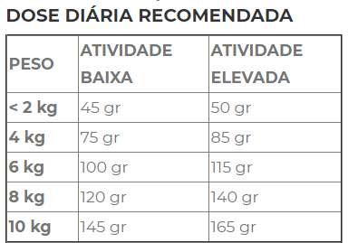Sardinha fresca (20 %), proteína de aves desidratada, batata-doce, mandioca, proteína de sardinha desidratada, gordura de aves, ovo fresco (8 %), ervilha forrageira, hidrolisado de proteína de aves, sementes de linho extrudidas, polpa de beterraba (3 %), substâncias minerais (tripolifosfato de sódio 0,7 %), azeite, algas (17 % DHA), leveduras (fonte de MOS 460 mg/kg), cenoura desidratada, tomate desidratado, maçã desidratada, Yucca schidigera (250 mg/kg), mexilhão verde (200 mg/kg), alecrim, groselha, romã.