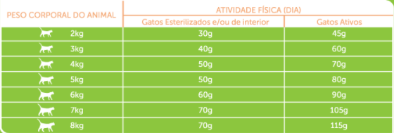 3a672a Vitamina A - 30.000 U.I./kg; 3a671 Vitamina D3 - 2.000 U.I./kg; 3a700 Vitamina E - 500 mg/kg; 3a821 Vitamina B1 - 45 mg/kg; Vitamina B2 - 25 mg/kg; 3a831 Vitamina B6 - 20 mg/kg; Vitamina B12 - 120 mcg/kg; 3a890 Cloreto de colina - 1,5 mg/kg; 30370 Taurina - 1.500mg/kg
