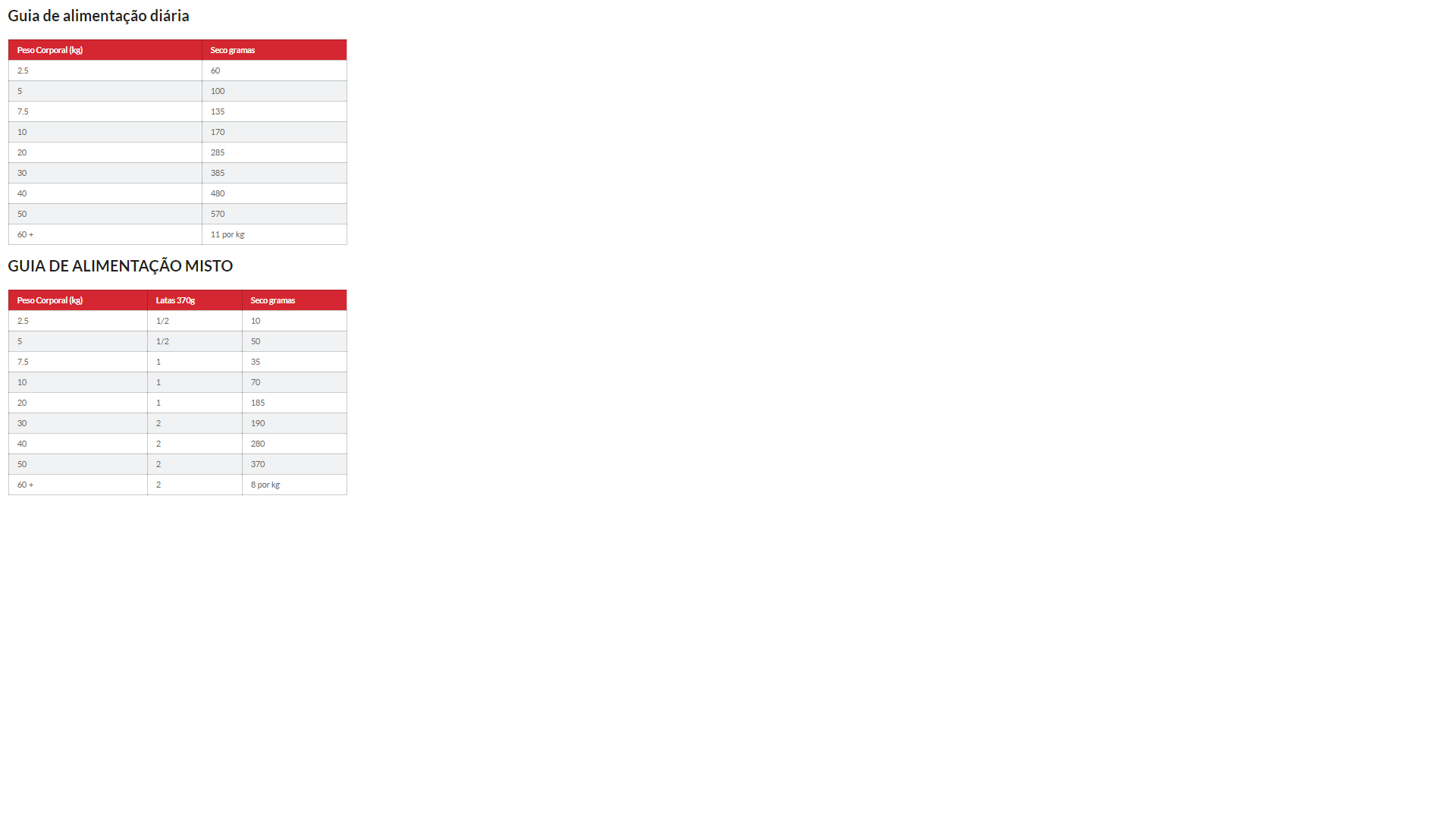 DICAS ÚTEIS ·Ajuste as quantidades diárias para manter o peso ideal. Em caso de dúvida, pergunte ao seu veterinário. ·É a primeira vez que utiliza este alimento? Misture quantidades o novo alimento com o alimento atual do seu do animal de companhia aumentando gradualmente a quantidade, durante um período de 7 dias até o alimentar unicamente com o novo alimento. ·Tenha sempre água fresca disponível! ·As necessidades nutricionais dos seus animais de companhia podem mudar à medida que os anos passam. Fale com o seu veterinário numa próxima consulta. ·Para evitar asfixia, mantenha a embalagem fora do alcance de animais de companhia e crianças.