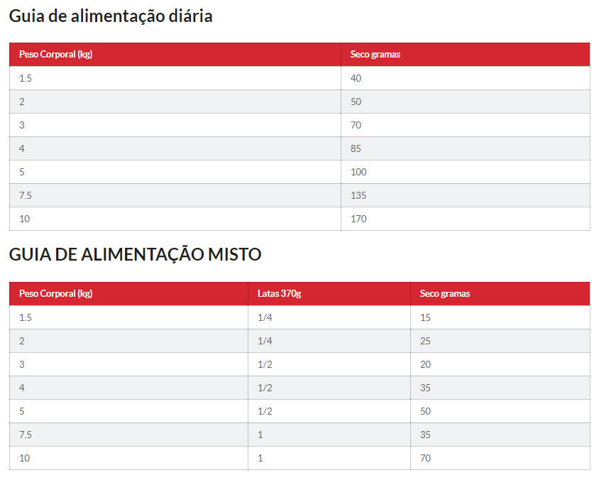 DICAS ÚTEIS ·Ajuste as quantidades diárias para manter o peso ideal. Em caso de dúvida, pergunte ao seu veterinário. ·É a primeira vez que utiliza este alimento? Misture quantidades o novo alimento com o alimento atual do seu do animal de companhia aumentando gradualmente a quantidade, durante um período de 7 dias até o alimentar unicamente com o novo alimento. ·Tenha sempre água fresca disponível! ·As necessidades nutricionais dos seus animais de companhia podem mudar à medida que os anos passam. Fale com o seu veterinário numa próxima consulta. ·Para evitar asfixia, mantenha a embalagem fora do alcance de animais de companhia e crianças.