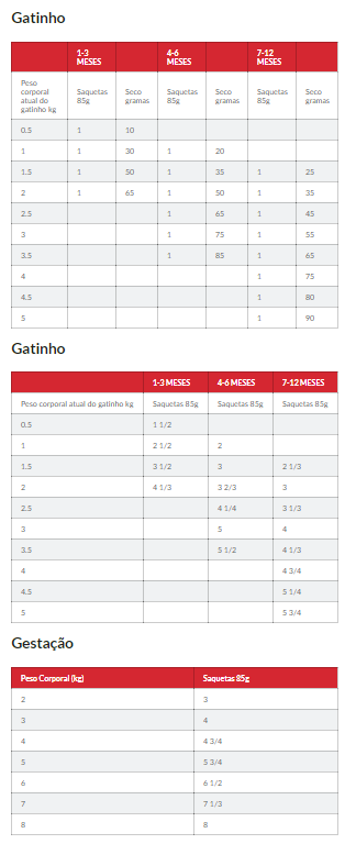DICAS ÚTEIS ·Ajuste as quantidades diárias para manter o peso ideal. Em caso de dúvida, pergunte ao seu veterinário. ·É a primeira vez que utiliza este alimento? Misture quantidades o novo alimento com o alimento atual do seu do animal de companhia aumentando gradualmente a quantidade, durante um período de 7 dias até o alimentar unicamente com o novo alimento. ·Tenha sempre água fresca disponível! ·As necessidades nutricionais dos seus animais de companhia podem mudar à medida que os anos passam. Fale com o seu veterinário numa próxima consulta. ·Para evitar asfixia, mantenha a embalagem fora do alcance de animais de companhia e crianças.