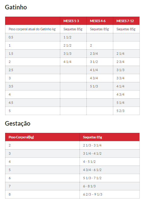 DICAS ÚTEIS ·Ajuste as quantidades diárias para manter o peso ideal. Em caso de dúvida, pergunte ao seu veterinário. ·É a primeira vez que utiliza este alimento? Misture quantidades o novo alimento com o alimento atual do seu do animal de companhia aumentando gradualmente a quantidade, durante um período de 7 dias até o alimentar unicamente com o novo alimento. ·Tenha sempre água fresca disponível! ·As necessidades nutricionais dos seus animais de companhia podem mudar à medida que os anos passam. Fale com o seu veterinário numa próxima consulta. ·Para evitar asfixia, mantenha a embalagem fora do alcance de animais de companhia e crianças.