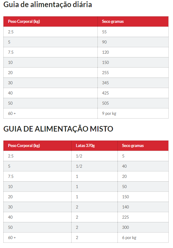 DICAS ÚTEIS ·Ajuste as quantidades diárias para manter o peso ideal. Em caso de dúvida, pergunte ao seu veterinário. ·É a primeira vez que utiliza este alimento? Misture quantidades o novo alimento com o alimento atual do seu do animal de companhia aumentando gradualmente a quantidade, durante um período de 7 dias até o alimentar unicamente com o novo alimento. ·Tenha sempre água fresca disponível! ·As necessidades nutricionais dos seus animais de companhia podem mudar à medida que os anos passam. Fale com o seu veterinário numa próxima consulta. ·Para evitar asfixia, mantenha a embalagem fora do alcance de animais de companhia e crianças.