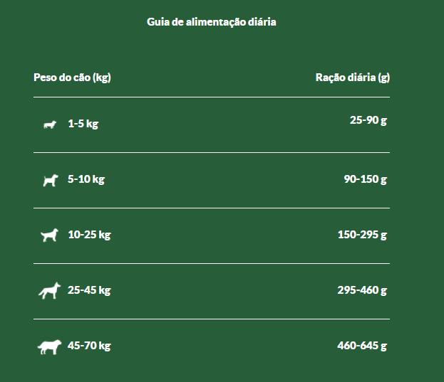 Humidade 8% Proteína 24% Gordura 12%Fibra bruta 3% Substâncias minerais 8% Cálcio 2% Fósforo 1,2% Sódio 0,5% Potássio 0,51% Magnésio 0,16% Ómega 3 0,21% Ómega 6 1,5% Vitamina A* 21000 UI Vitamina D3* 1400 UI Vitamina E* 75 mg Ferro* 78 mg Iodo* 1,31 mg Cobre* 8 mg Manganês* 36,5 mg Zinco* 80 mg Selénio* 0,1 mg Energia metabolizável 3610 kcal/kg. *Adicionado.
