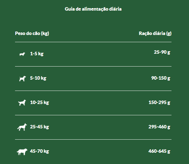 Humidade 8% Proteína 24% Gordura 12% Fibra bruta 3% Substâncias minerais 8% Cálcio 1,9% Fósforo 1,2% Sódio 0,5% Potássio 0,55% Magnésio 0,15% Ómega 3 0,15% Ómega 6 1,5% Vitamina A* 21000 UI Vitamina D3* 1400 UI Vitamina E* 75 mg Ferro* 78 mg Iodo* 1,31 mg Cobre* 8 mg Manganês* 36,5 mg Zinco* 80 mg Selénio* 0,1 mg Energia metabolizável 3610 kcal/kg.*Adicionado