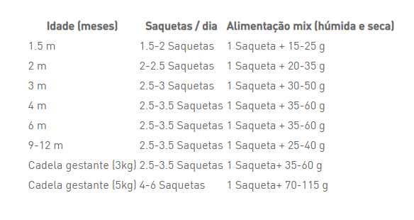 Carne e subprodutos animais, extratos de proteínas vegetais, derivados de origem vegetal, cereais, sais minerais, óleos e gorduras, leveduras, açúcares diversos. Aditivos nutricionais: Vitamina D3: 200 UI, E1 (Ferro): 4 mg, E2 (Iodo): 0,3 mg, E4 (Cobre): 2,4 mg, E5 (Manganésio): 1,4 mg, E6 (Zinco): 14 mg. Proteínas: 12.0% -Gorduras: 4.0% - Sais minerais: 1.6% - Fibra bruta: 0.8%.