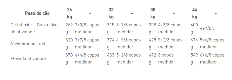 Milho, proteína de carne de aves desidratada, trigo, glúten de milho, fibras vegetais, proteínas hidrolisadas de origem animal, gorduras de origem animal, isolado de proteína vegetal*, polpa de beterraba, óleo de peixe, leveduras ou partes das mesmas, óleo de soja, minerais, cascas e sementes depsillium, óleo de borragem, crustáceos hidrolisados (fonte de glucosamina), extrato de flor de tagete (fonte de luteína), cartilagem hidrolisada (fonte de condroitina). Aditivos (por kg): Aditivos nutricionais: Vitamina A: 24000 UI, Vitamina D3: 1100 UI, E1 (Ferro): 35 mg, E2 (Iodo): 3,6 mg, E4 (Cobre): 11 mg, E5 (Manganésio): 46 mg, E6 (Zinco): 135 mg, E8 (Selénio): 0,06 mg - L-carnitina: 200 mg. Aditivos tecnológicos: Clinoptilolite de origem sedimentar: 10 g - Conservantes - Antioxidantes. Constituintes analíticos: Proteínas: 28.0% -Gorduras: 13.0% - Sais minerais: 5.8% - Fibra bruta: 6.7%. * L.I.P.: Proteína selecionada pela sua elevadíssima digestibilidade.