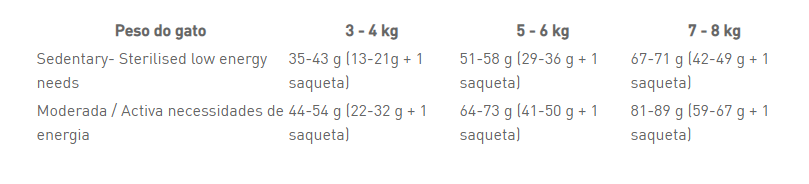 Proteínas de aves desidratadas, milho, arroz, isolato de proteína vegetal*, gorduras animais, trigo, fibras vegetais, farinha de trigo, hidrolisado de proteínas animais, glúten de milho, polpa de chicória, óleo de peixe, sais minerais, óleo de soja, tegumento e sementes de psyllium, leveduras e produtos semelhantes, fruto-oligossacarídeos, hidrolisado de leveduras (fonte de mano-oligossacarídeos), óleo de borragem (0,1%), hidrolisado de crustáceos (fonte de glucosamina), extrato de flor de tagete (fonte de luteína), hidrolisado de cartilagens (fonte de condroitina). ADITIVOS (por kg): Aditivos nutritivos: Vitamina A: 30.500UI, Vitamina D3: 800UI, E1 (Ferro): 40mg, E2 (Iodo): 4mg, E4 (Cobre): 12mg, E5 (Manganês): 51mg, E6 (Zinco): 154mg, E8 (Selénio): 0,08mg, L-carnitina: 200mg Aditivos tecnológicos: Clinoptilolite de origem sedimentar: 10g - Conservantes - Antioxidantes. CONSTITUINTES ANALÍTICOS: Proteína bruta: 30% - Matéria gorda bruta: 16% - Cinza bruta: 7,4% - Fibra bruta: 5,6% - Por kg: Ácidos gordos ómega 6: 38,9g - Ácidos gordos ómega 3: 9,6g.