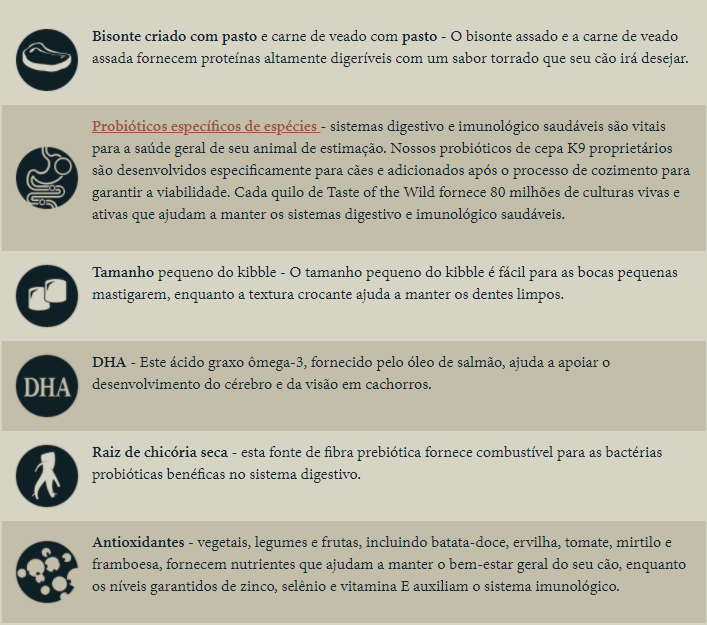 Seus animais de estimação desejam os mesmos sabores que seus ancestrais. Vá em frente e conceda-se a eles. A ciência moderna prova que seu cão ou gato ainda compartilha o DNA do antigo canino ou felino. Os alimentos para cães e gatos Taste of the Wild foram criados para dar aos animais de estimação e aos pais de animais de estimação uma opção inspirada nas fontes de proteína que seu cão ou gato deve comer. Para dar aos cães e gatos domésticos a vitalidade pretendida pela natureza, seus alimentos para animais de estimação devem conter todos os ingredientes e nutrientes de que precisam para prosperar. E é exatamente isso que eles obtêm com todas as receitas do Taste of the Wild: alimentos premium e completos para animais de estimação com base nas fontes de proteína da dieta ancestral do seu animal de estimação.