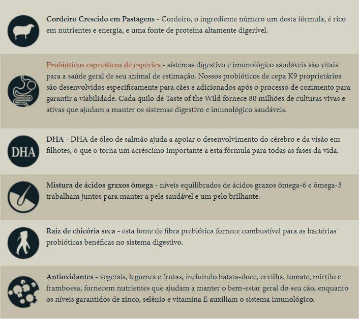 Seus animais de estimação desejam os mesmos sabores que seus ancestrais. Vá em frente e conceda-se a eles. A ciência moderna prova que seu cão ou gato ainda compartilha o DNA do antigo canino ou felino. Os alimentos para cães e gatos Taste of the Wild foram criados para dar aos animais de estimação e aos pais de animais de estimação uma opção inspirada nas fontes de proteína que seu cão ou gato deve comer. Para dar aos cães e gatos domésticos a vitalidade pretendida pela natureza, seus alimentos para animais de estimação devem conter todos os ingredientes e nutrientes de que precisam para prosperar. E é exatamente isso que eles obtêm com todas as receitas do Taste of the Wild: alimentos premium e completos para animais de estimação com base nas fontes de proteína da dieta ancestral do seu animal de estimação.
